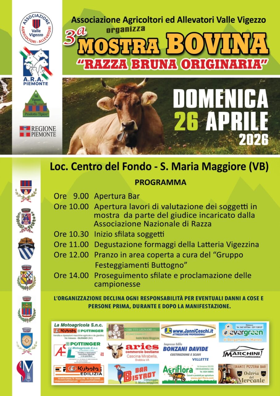 Domenica 26 aprile 2026, presso il Centro del Fondo a S. Maria Maggiore (VB), si svolgerà la 3ª Mostra Bovina “Razza Bruna Originaria”, organizzata dall’Associazione Agricoltori ed Allevatori Valle Vigezzo.
