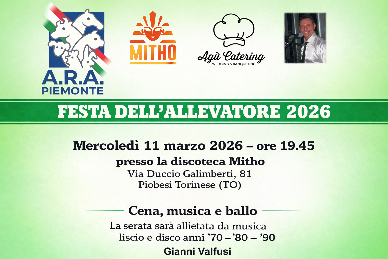 L’evento si terrà mercoledì 11 marzo 2026 presso la discoteca MITHO, in Via Duccio Galimberti, 81 – Piobesi Torinese (TO), con inizio alle ore 19:45.