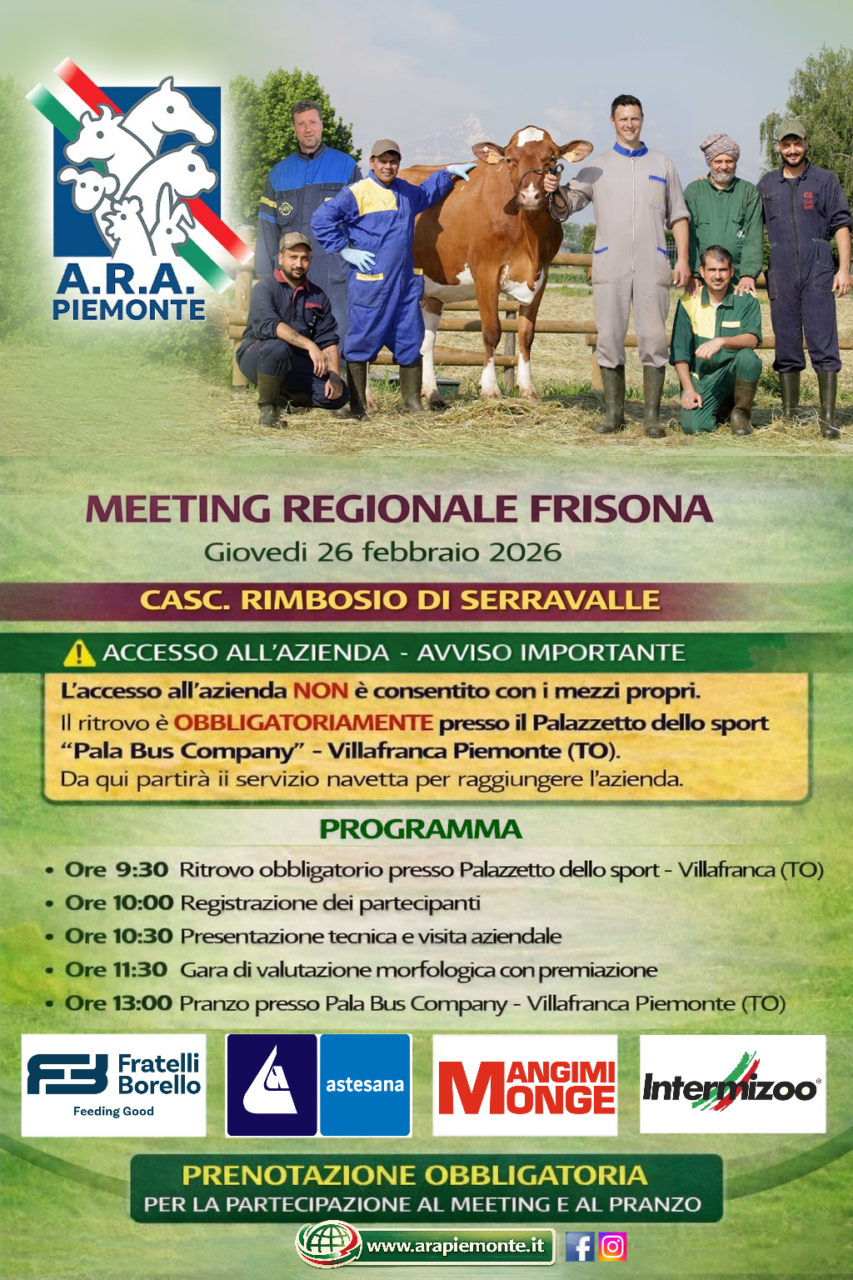 ARAP Piemonte organizza il Meeting Regionale Frisona, in programma giovedì 26 febbraio 2026 presso Cascina Rimbosio di Serravalle a Villafranca Piemonte.